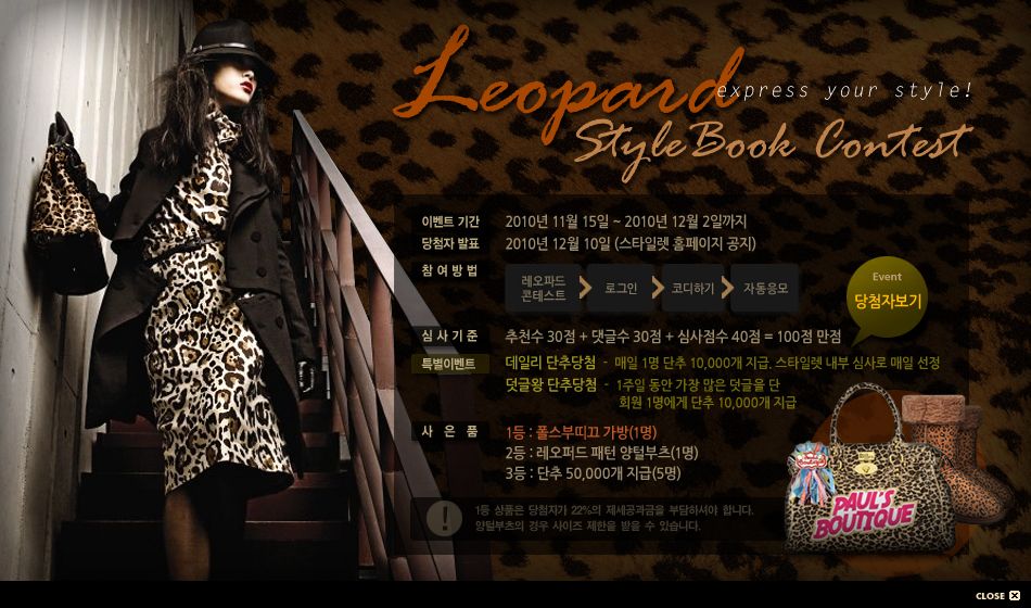 스타일렛에서 진행하는 스타일북 컨테스트는 북 툴을 활용하여 패션 코디 및 감각을 뽐낼 수 있는 공간으로 이번 11월에 주목받고 있는 2010 F/W 패션 트랜드라 할 수 있는 레오퍼드[Leopard] 상품을 활용한 다양한 북 컨테스트가 진행 되고 있다.