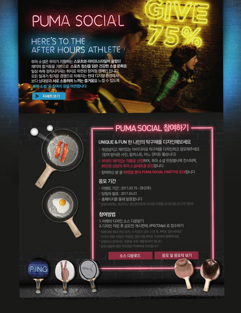 푸마 소셜은 푸마가 지향하는 스포츠와 라이프스타일이 융합된 재미와 즐거움을 기본으로 스포츠 정신을 담은 건강한 소셜 문화를 일상 속에 정착시키자는 취지로 마련된 참여형 캠페인입니다.