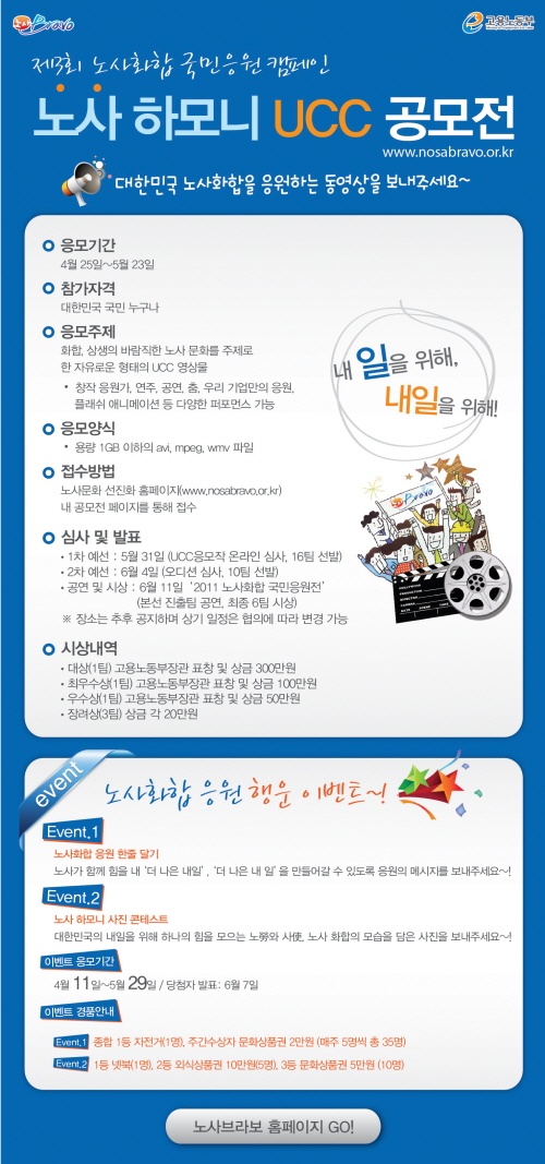 -공연 및 시상 : 6월 11일 ' 2011 노사화합 국민응원전' (본선 진출팀 공연, 최종 6팀 시상)