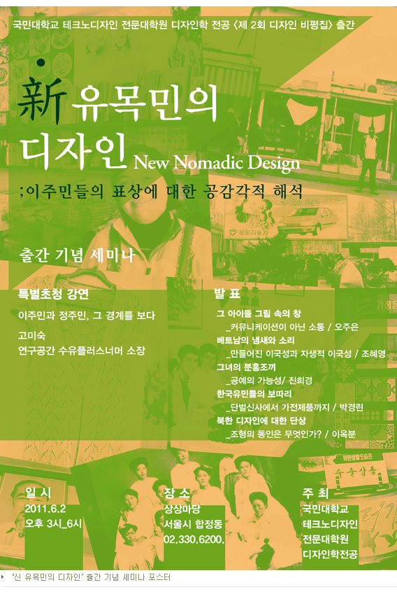 출간과 함께 책의 제목인 ‘신 유목민의 디자인’이라는 주제로 출간 기념 세미나가 열리기도 한다. d-페다고지 연구소 조현신 소장의 기획으로 6월 2일 홍대에 위치한 상상마당에서 열릴 이번 세미나의 부제는 ‘낯설고 불안한 이주민들의 표상에 대한 공감각적 해석’. ‘이주민과 정주민, 그 경계를 보다’라는 제목으로 연구공간 수유플러스너머의 고미숙 소장의 특별강연과 함께 ‘그 아이들 그림 속의 창_커뮤니케이션이 아닌 소통’, ‘베트남의 냄새와 소리_만들어진 이국성과 자생적 이국성’, ‘그녀의 분홍조끼 : 공예의 가능성’ ,‘한국유민들의 보따리_단벌신사에서 가전제품까지’, ‘북한 디자인에 대한 단상_조형의 동인은 무엇인가’의 내용으로 오주은, 조혜영, 진희경, 박경린, 이옥분 연구원의 발표가 이어질 예정이다.