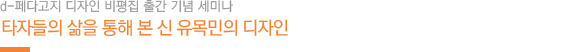 ‘신 유목민의 디자인’은 국민대학교 테크노디자인전문대학원 연구소 d-페다고지의 두 번째 디자인 비평집이다. 낯설고 불안한 이주민들의 표상에 대한 공감각적 해석을 담은 이 책에는 10여 년 전부터 한국 사회에서 본격적으로 이야기되기 시작했던 소수민족, 다문화 현상을 그들의 물건을 통해 분석한 결과가 담겨있다.