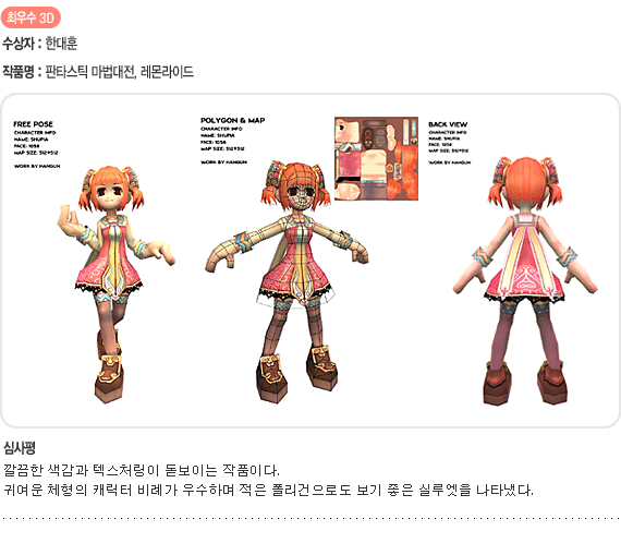 특히, 예년 대비 대폭 상승한 3D 로우폴리곤 부문의 응모작 수와 작품수준, 그리고 신설된 게임원화 부문에서의 선전이 매우 두드러졌다.