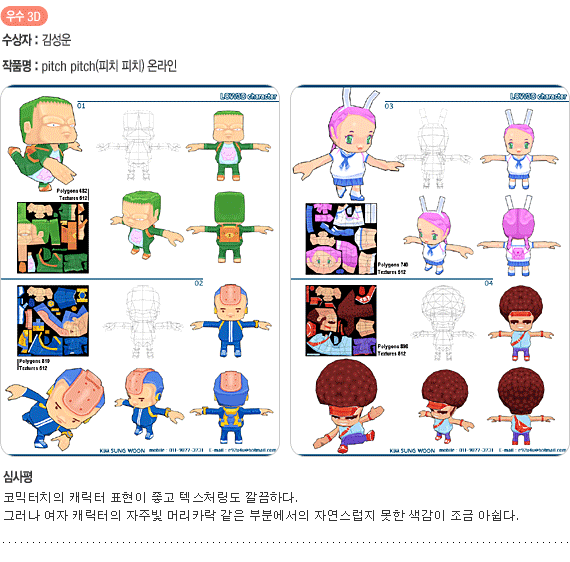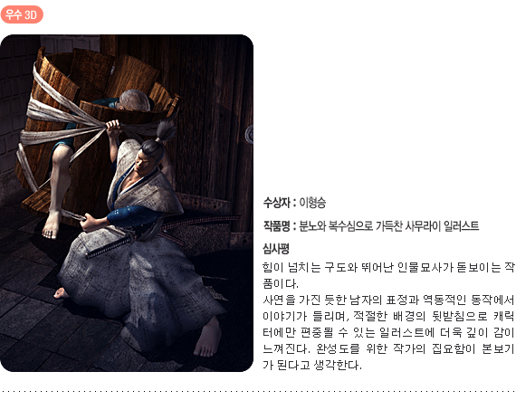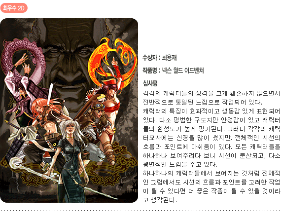 모든 부문에서 좋은 작품들이 접수됐으나, 특히 두드러진 분야는 3D 부문의 작품 그리고 2D 일러스트 부문이었다. 두 부문에는 비록 수상작으로 선정되지 못했지만 정말 아쉬운 작품들이 많았다.